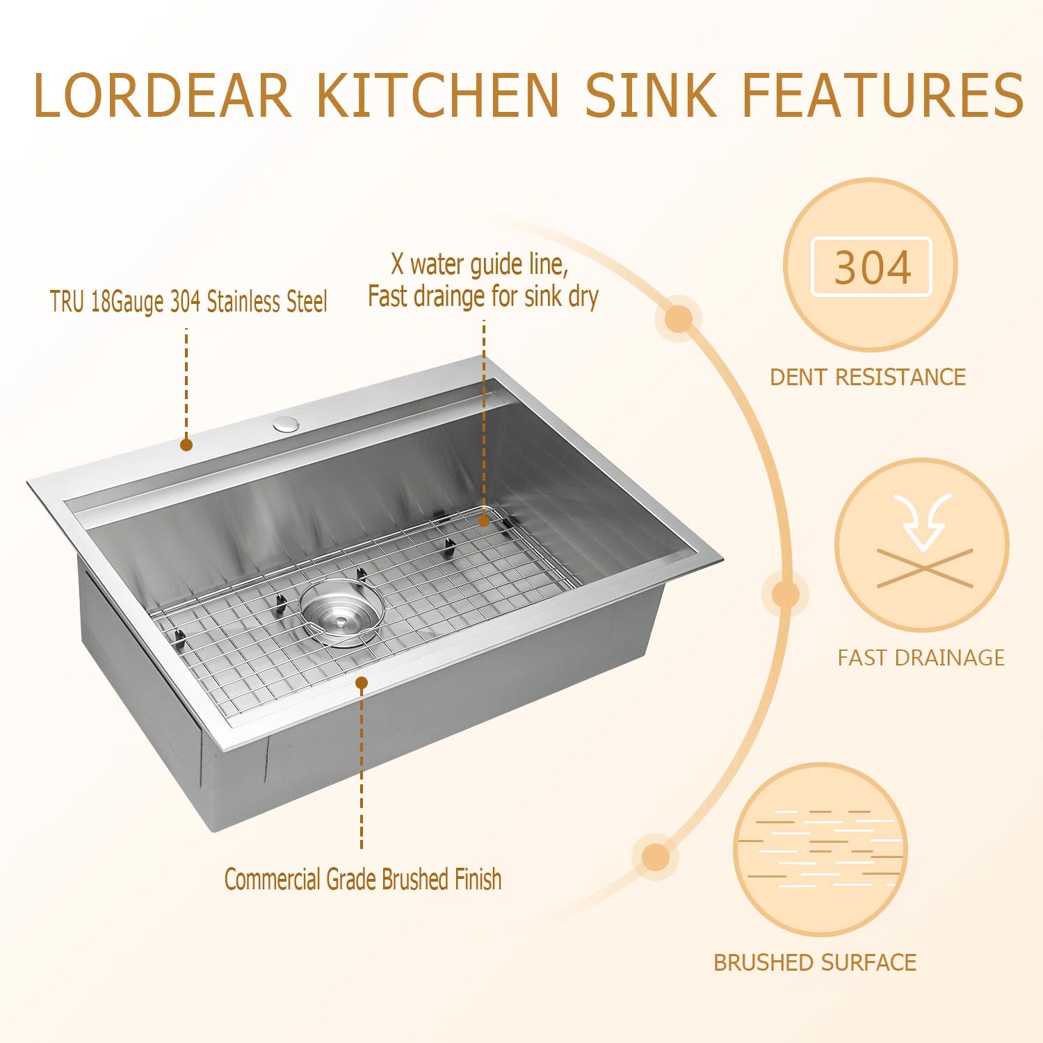 Lordear brand drop in kitchen sink is designed with four long X shaped water guidelines and around the water hole is a slope design to allow complete water drainage;
