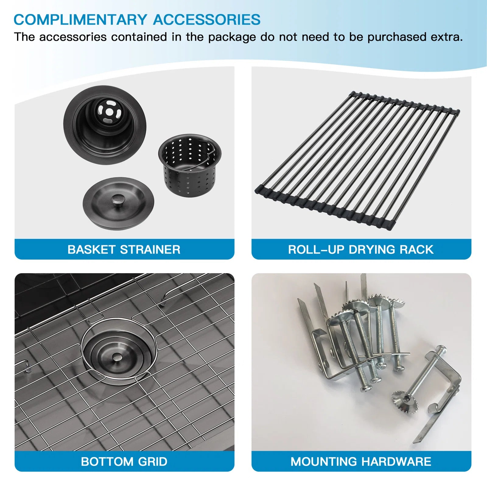 | Included Components | 1x 33 black drop in sink, 1x clips/template/instruction, 1x drain assembly, 1x rollup rack, 1x stainless steel bottom grid |