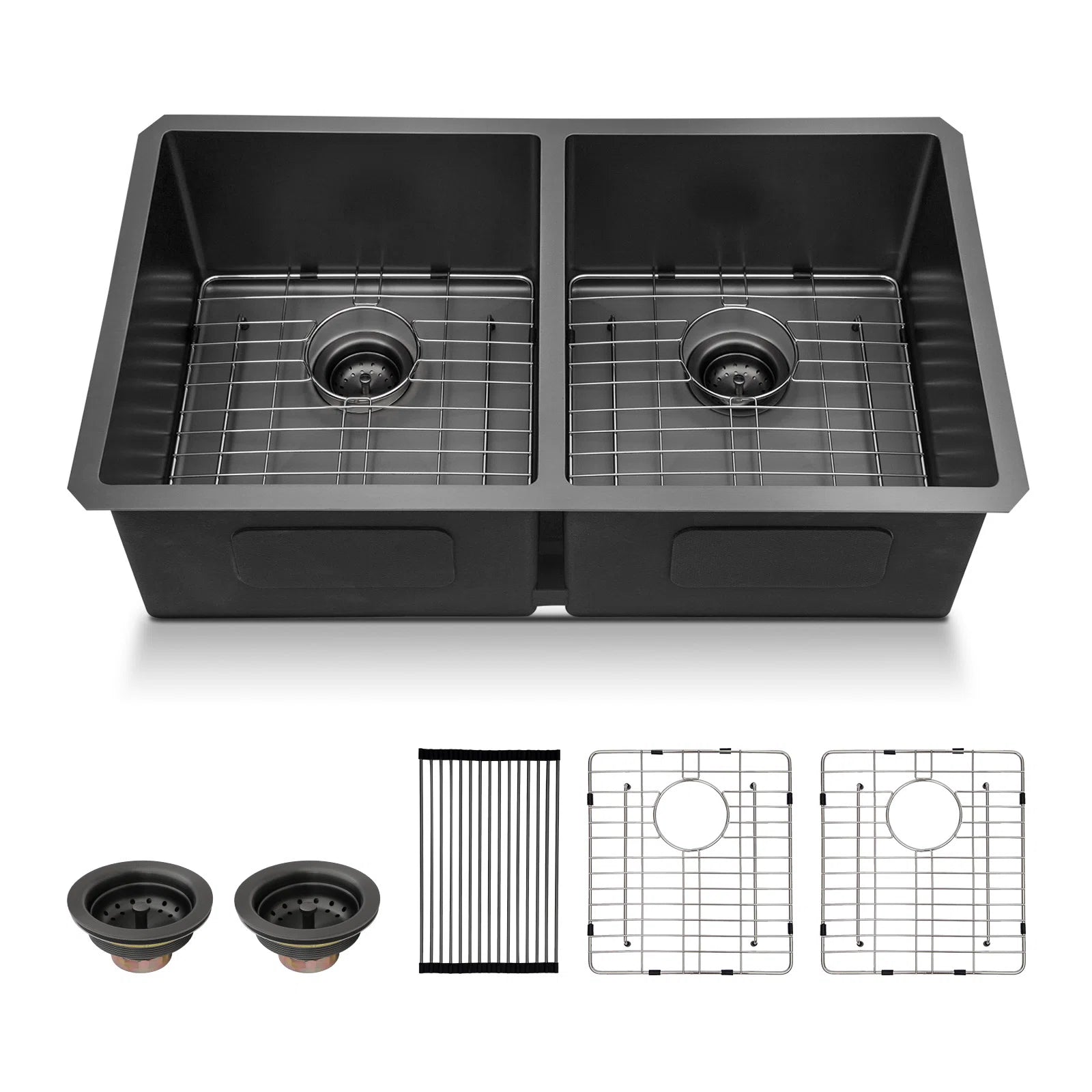 | Included Components | Package includes a gunmetal black double bowl sink, roll-up rack, bottom rinse grids, basket strainer drains, cutout template, mounting clips and installation instruction |