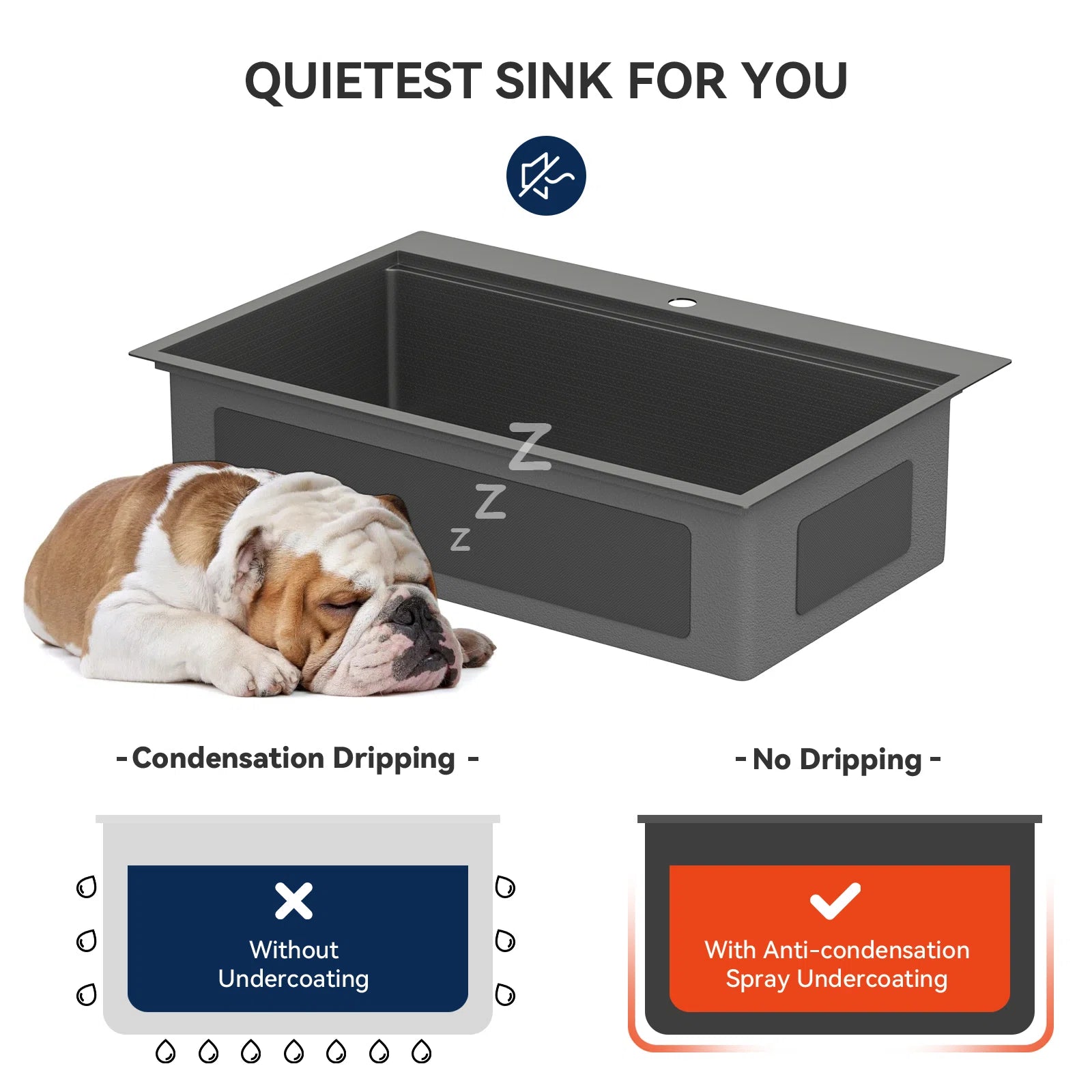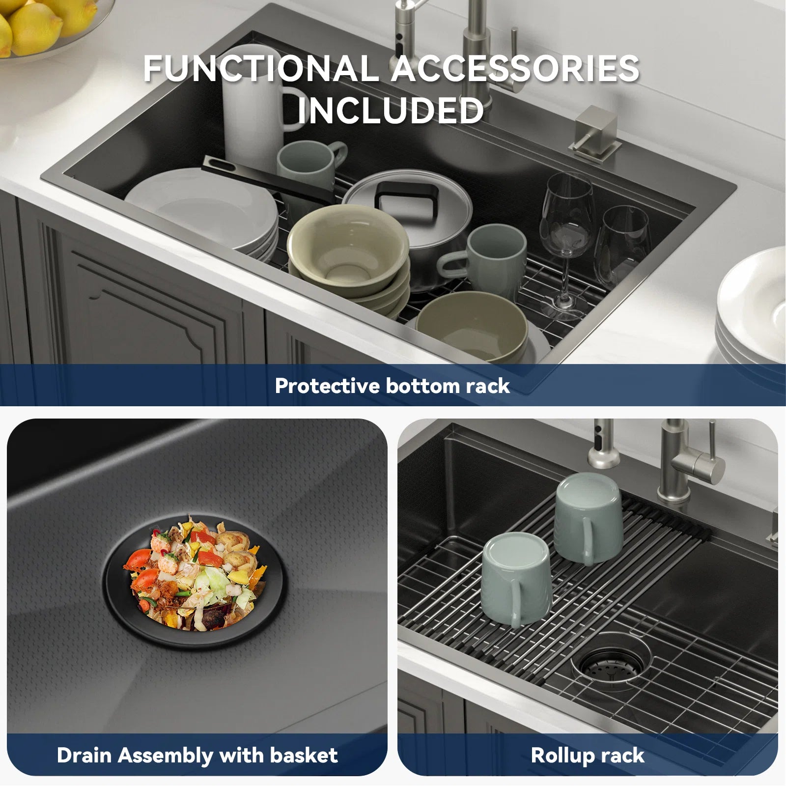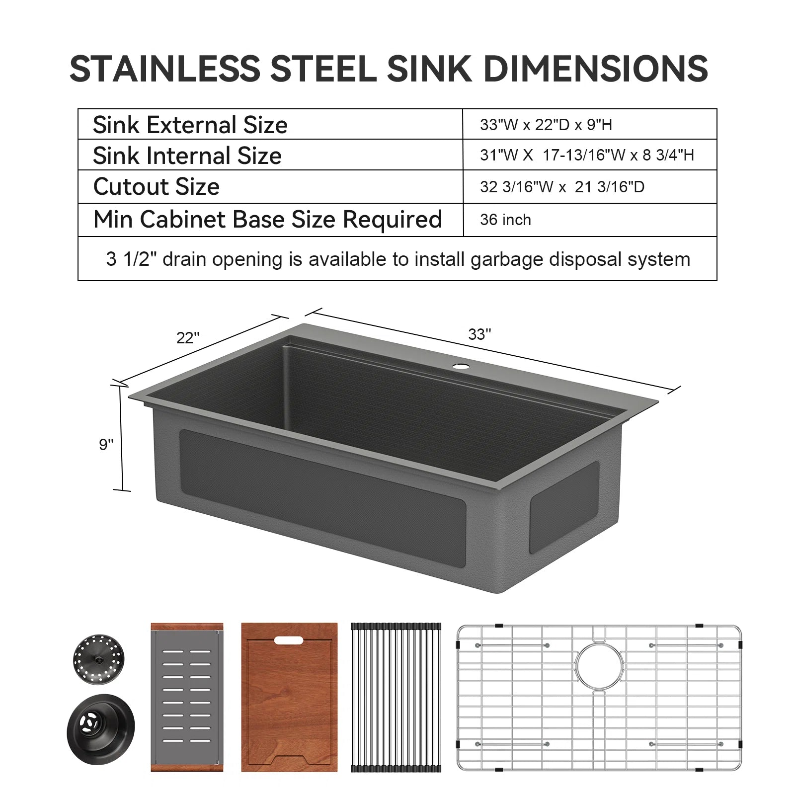 Our 33 inch drop in kitchen sink fits many garbage disposal brands and models, makes installation easy.