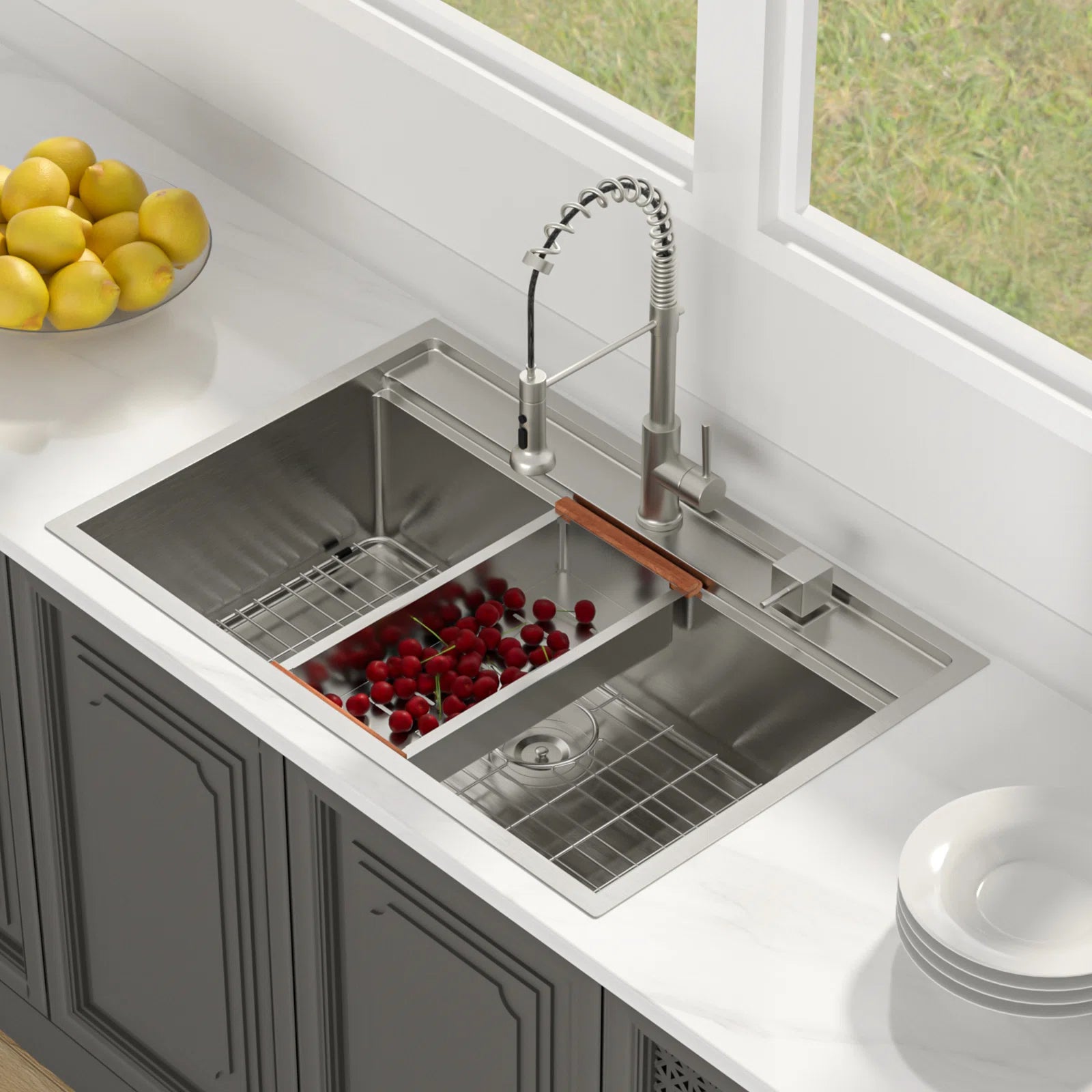 | Included Components | colander, cutting board, stainless steel basket strainer drain, stainless steel bottom rinse grid, stainless steel roll-up rack |