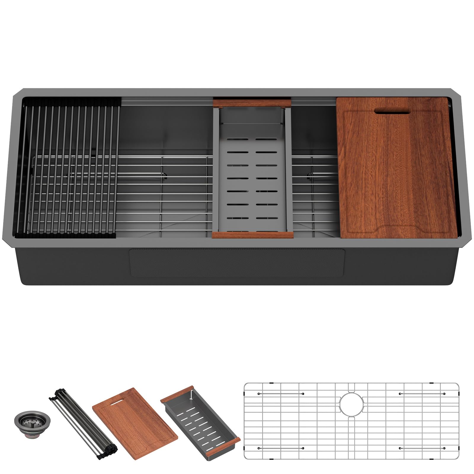 | Included Components | Undermount sink stainless steel workstation, bottom grid, basket strainer, cutting board, roll-up rack, drain assembly, colander |