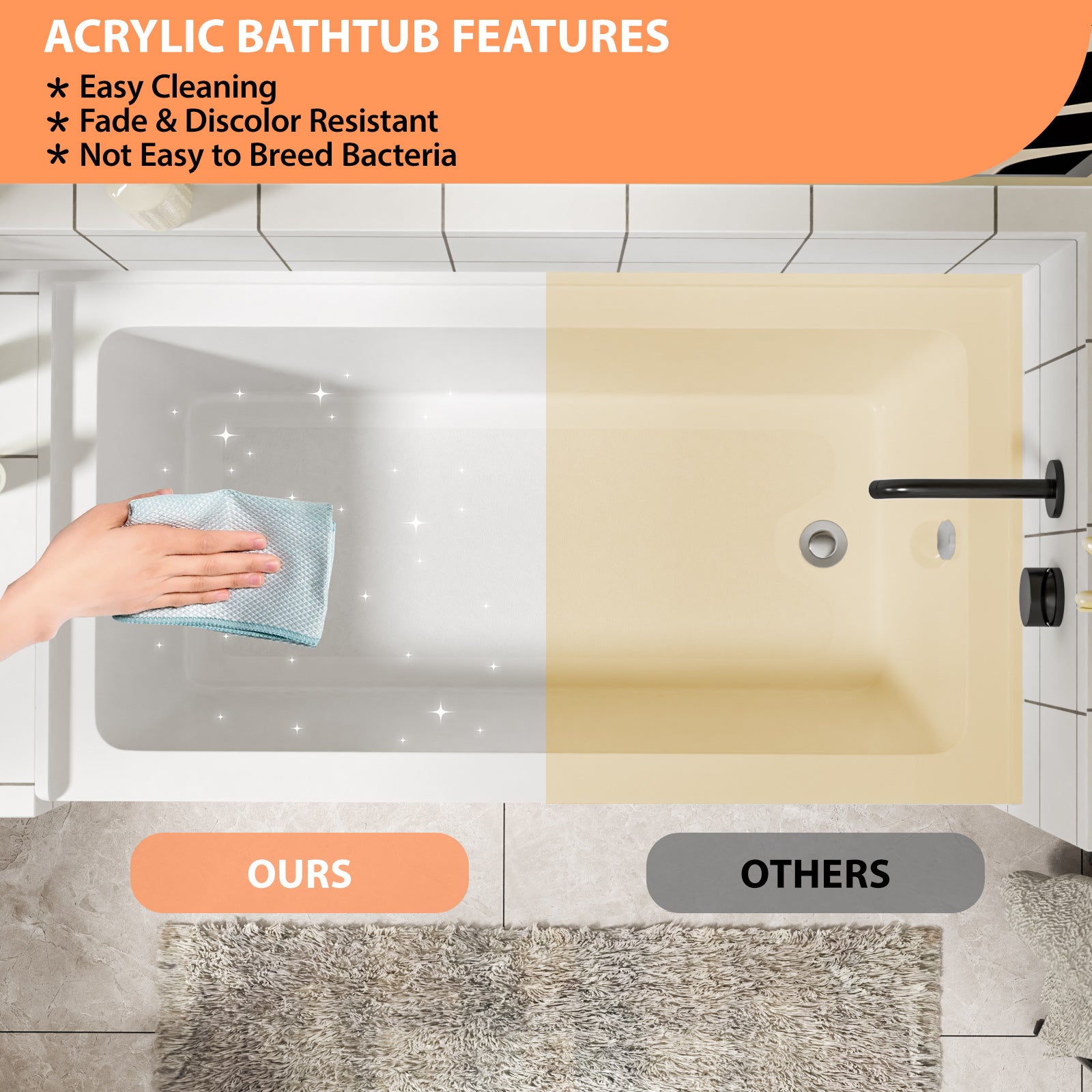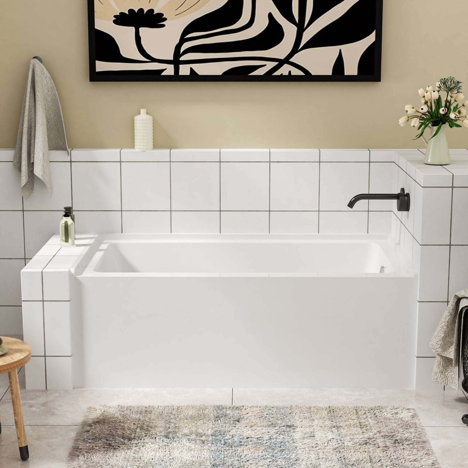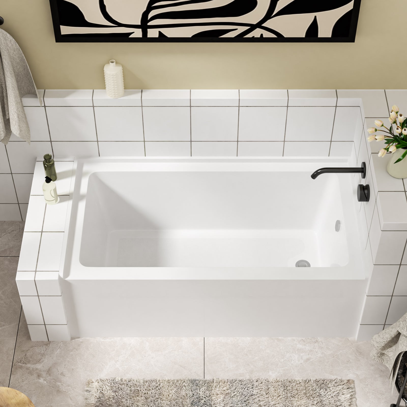 Premium Acrylic Construction: This alcove bathtub is crafted from high-quality acrylic material, ensures long-lasting durability and a smooth, comfortable surface. The acrylic is fade and discoloration-resistant, maintaining its pristine appearance over time.
