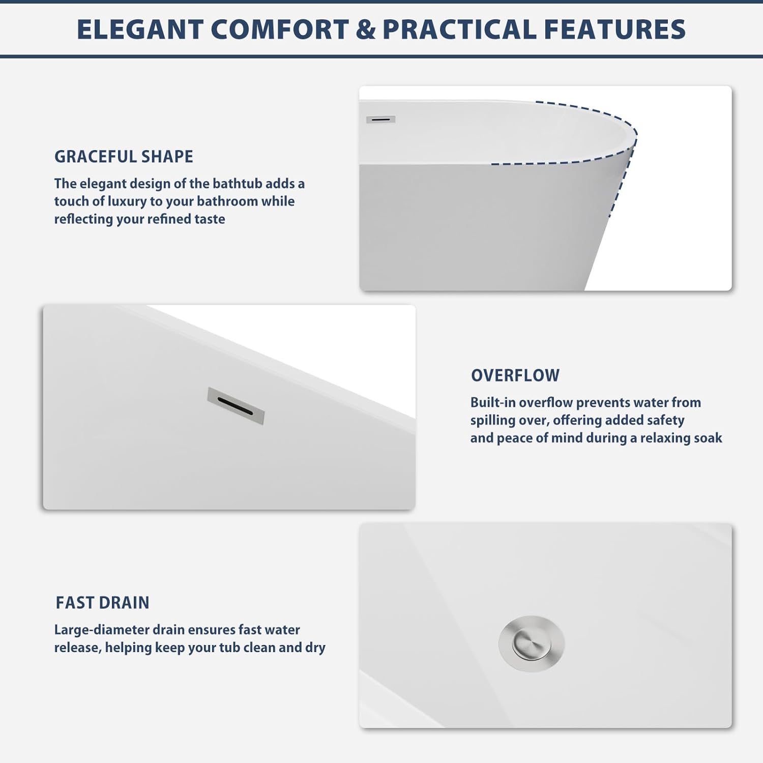 The built-in slotted overflow with a sleek metal cover prevents spills and allows for a deeper, more relaxing soak.