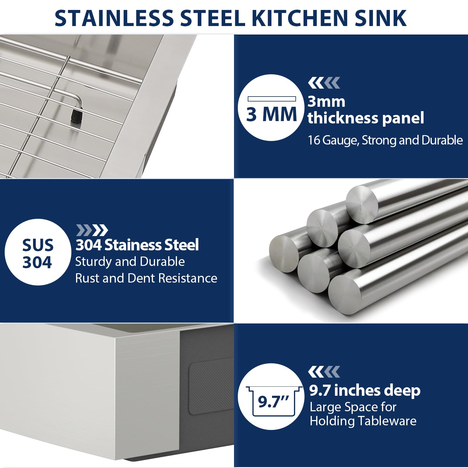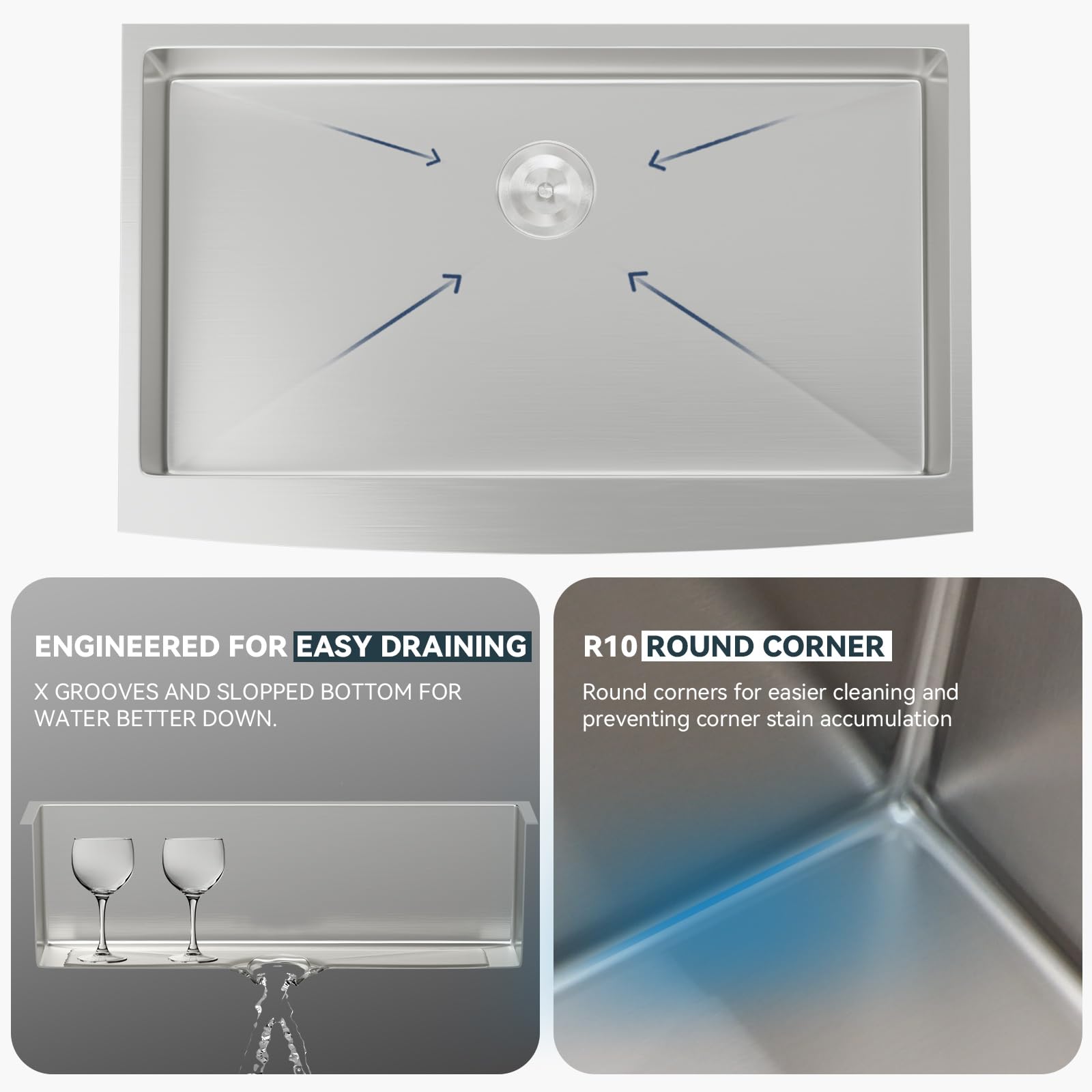 Rust-resistant heavy duty T304 stainless steel. Our farm style kitchen sinks are built for long term use.