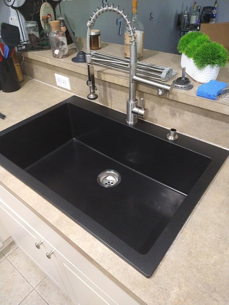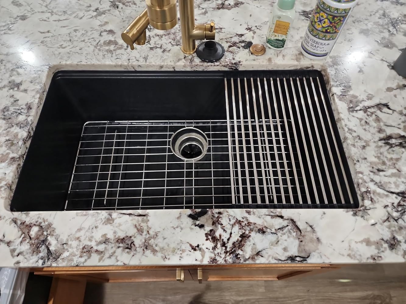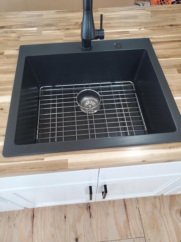 | Included Components | 25-inch composite drop-in kitchen sink, roll-up rack, stainless steel dish grid, drain assembly with basket, clips/cutout template, and installation instructions. |