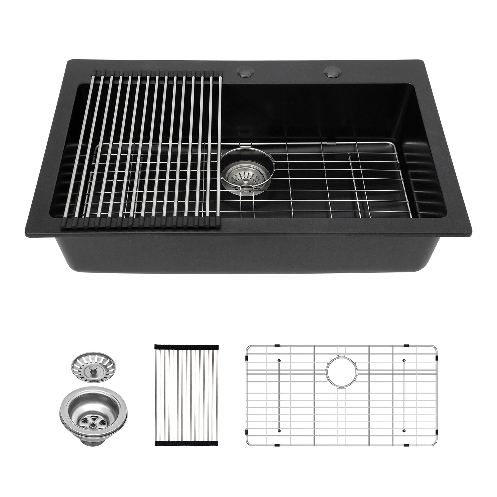 | Included Components | 25-inch composite drop-in kitchen sink, roll-up rack, stainless steel dish grid, drain assembly with basket, clips/cutout template, and installation instructions. |