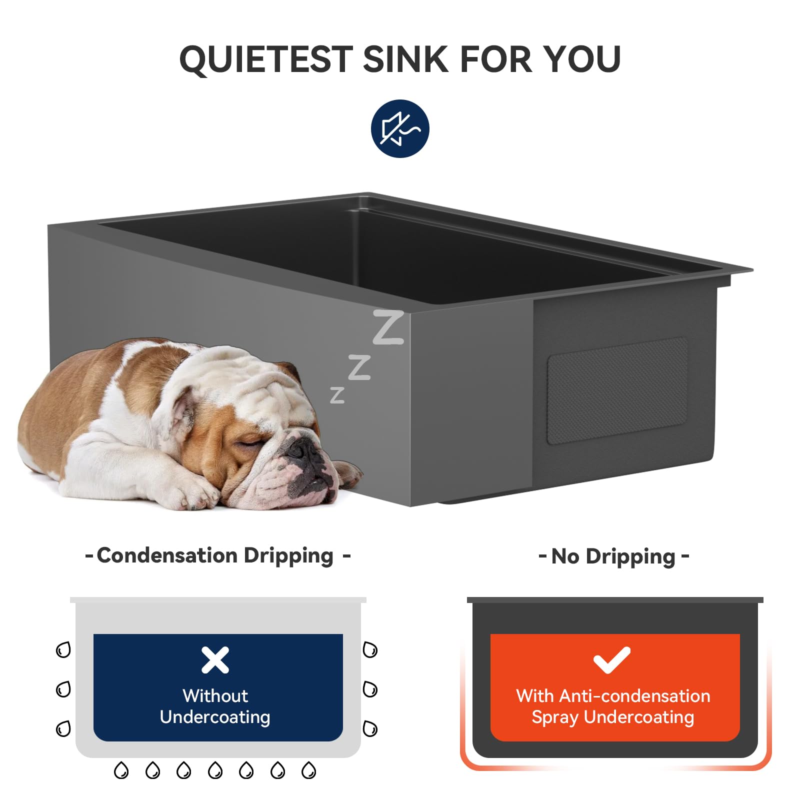 TOur black farmhouse kitchen sink has designed with 5 pieces rubber pads to absorb the noise of runing water and tablewares, indeed very quiet.
