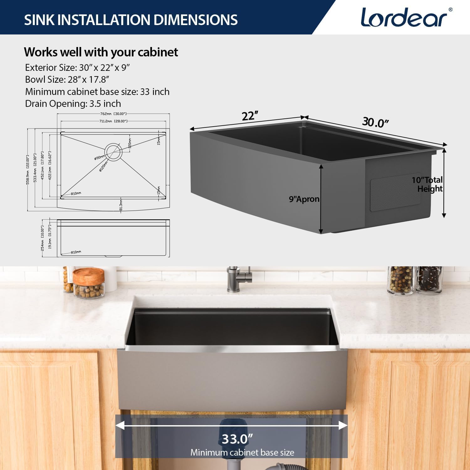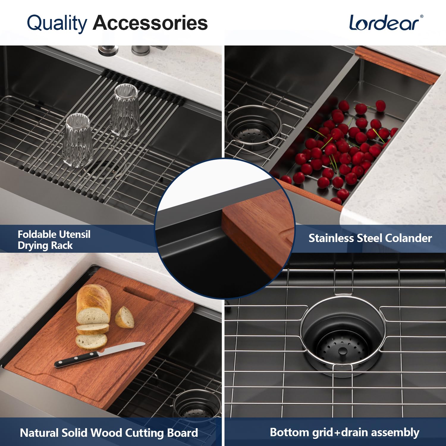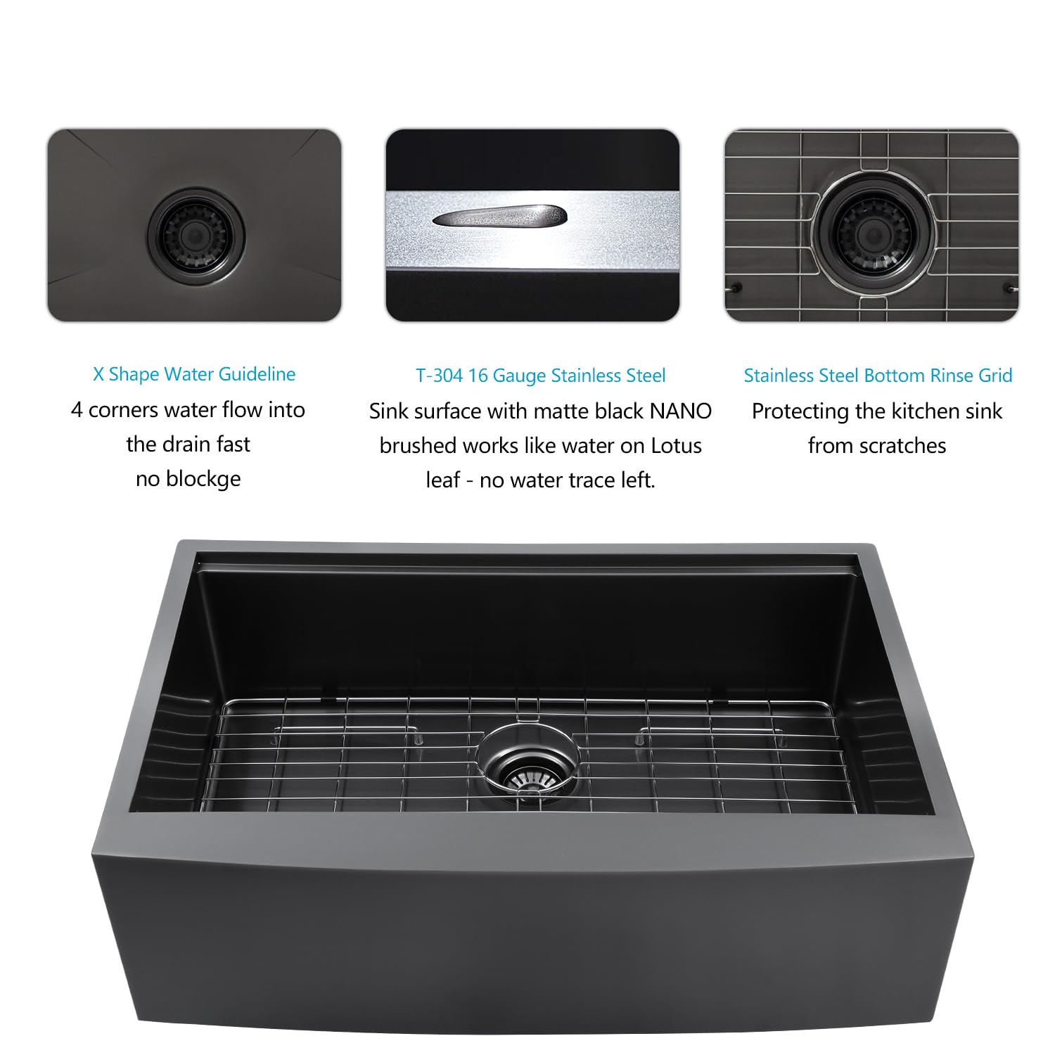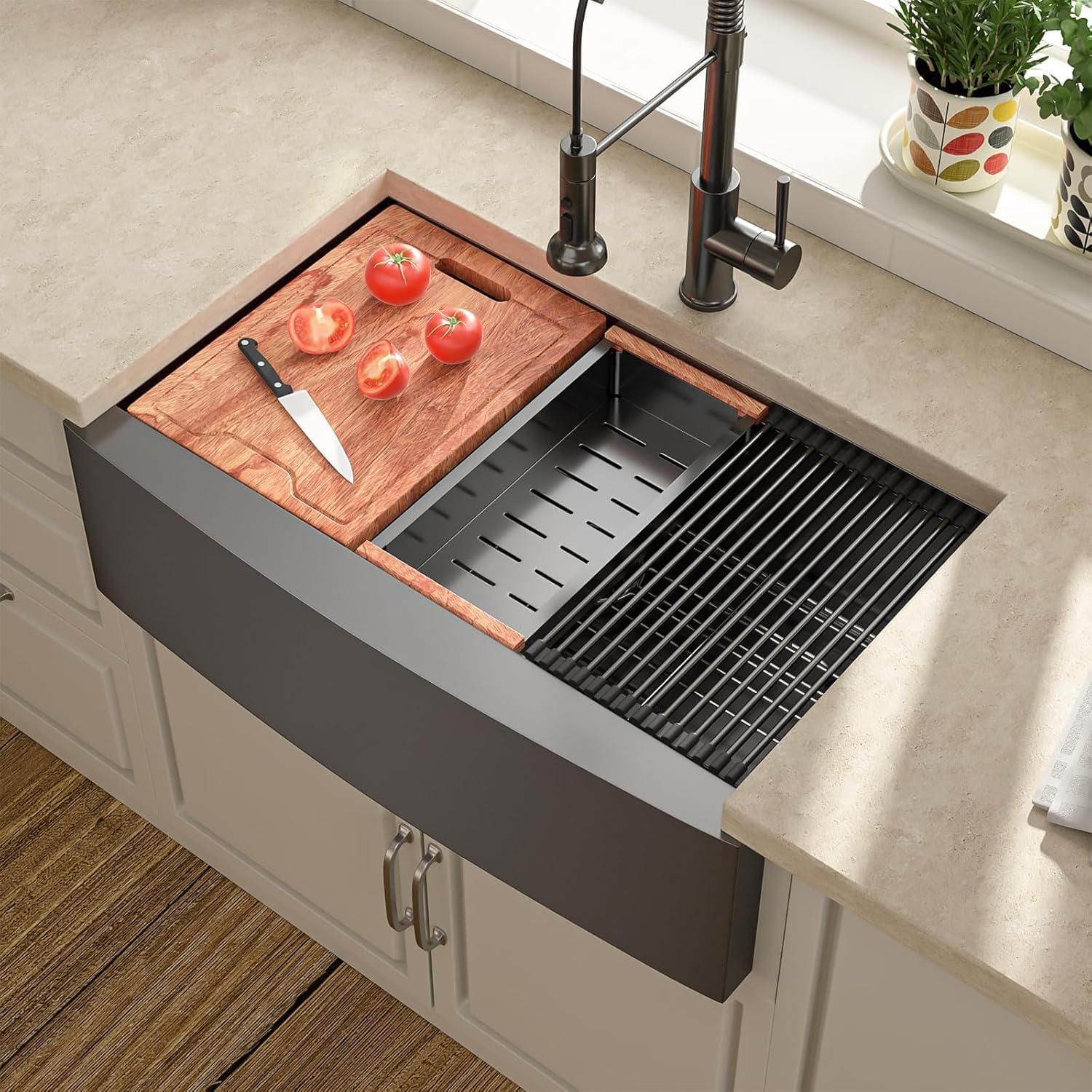 | Included Components | 30 inch farmhouse sink gunmetal black workstation, basket strainer drain, cutout template, cutting board, colander, mounting clips and installation instruction, roll-up rack, bottom rinse grids |