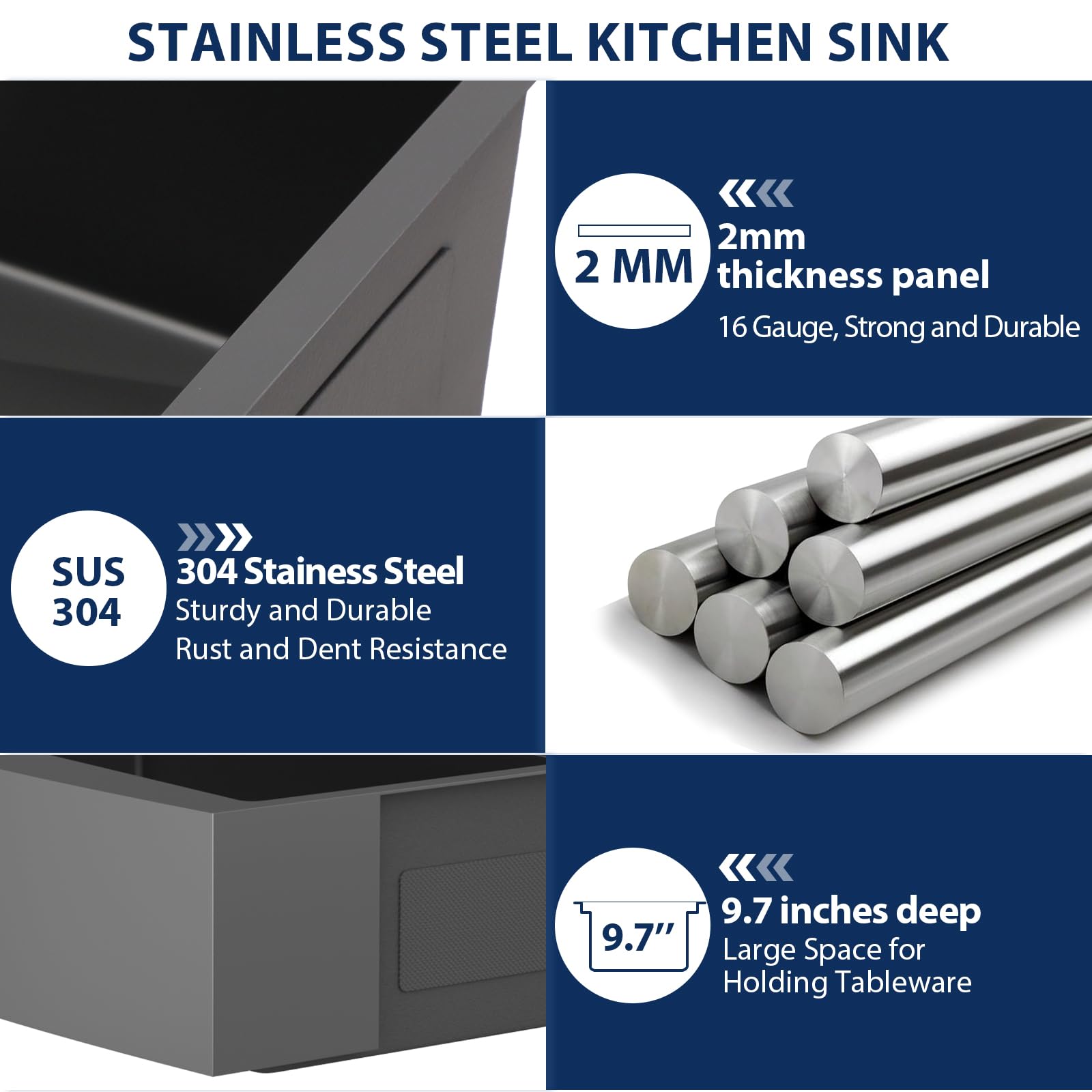 The matte black apron front kitchen sink is made of 16ga thickest steel which is tough and durable for long term use (Do not use steel wool to clean the sink, that will hurt the stainless product)