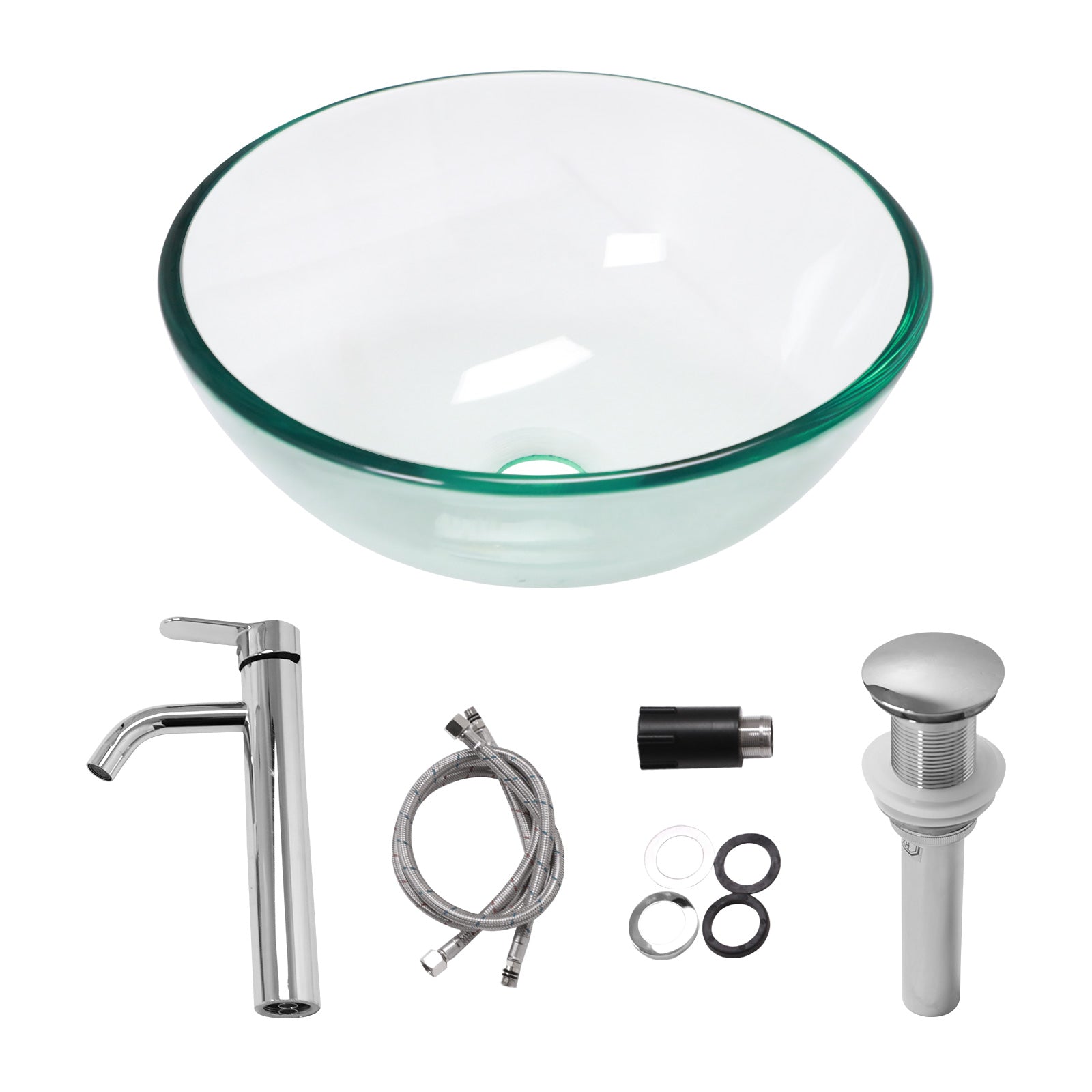 Included Components | 16.53 x 16.53 inch glass vessel sink, a faucet, pop-up drain, hot and cold water lines, and a screw package |