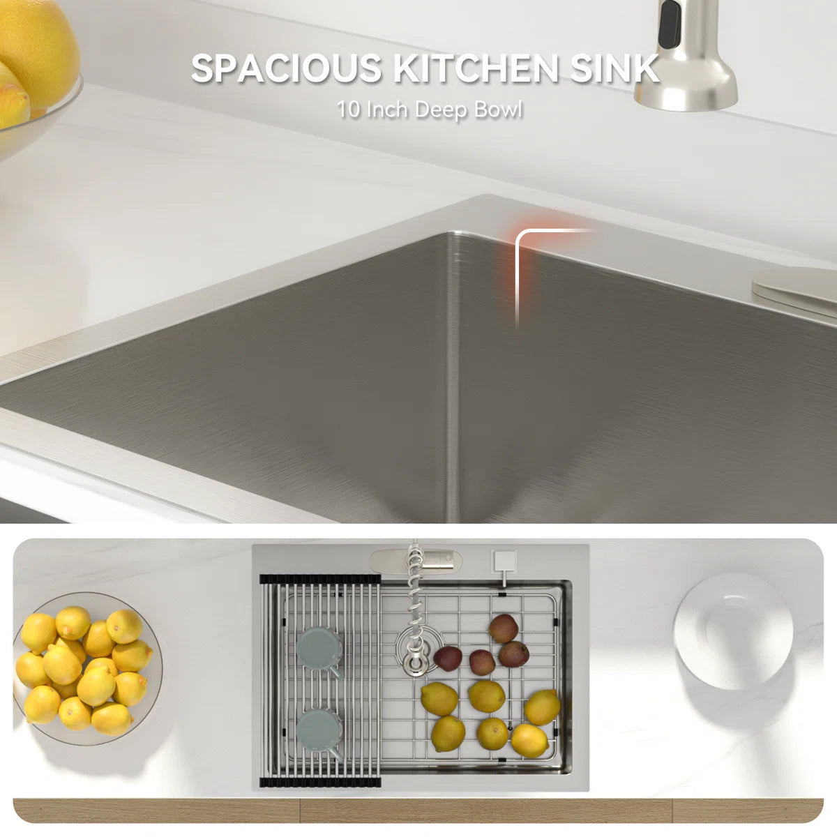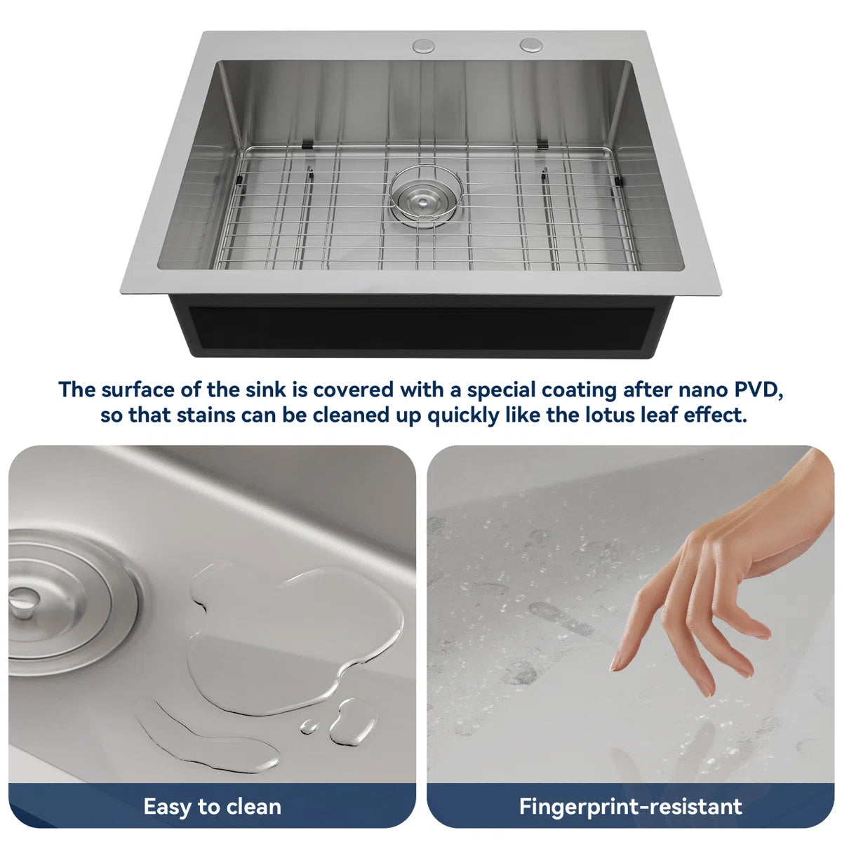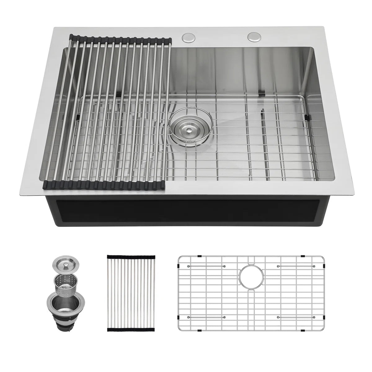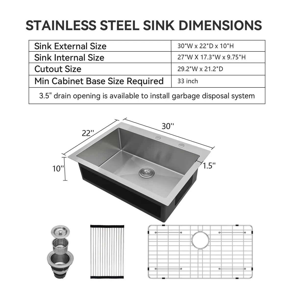| Included Components | 3.5" basket strainer drain, 30 drop in kitchen sink, cutout template, roll-up drying rack, bottom dish grid, topmount installation instruction |