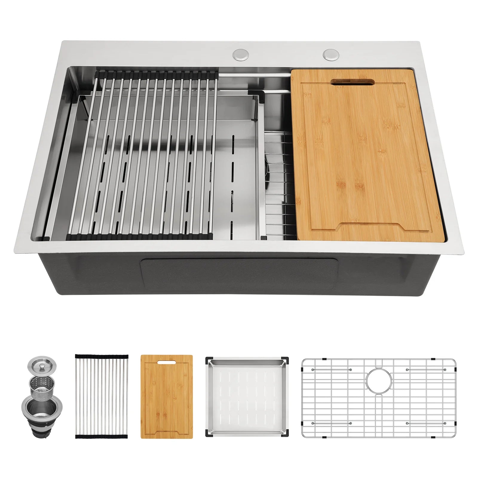 | Included Components | 33 drop in kitchen sink, cutting board&colander, drain strainer&cutout template, roll-up rack&bottom rinse grids |