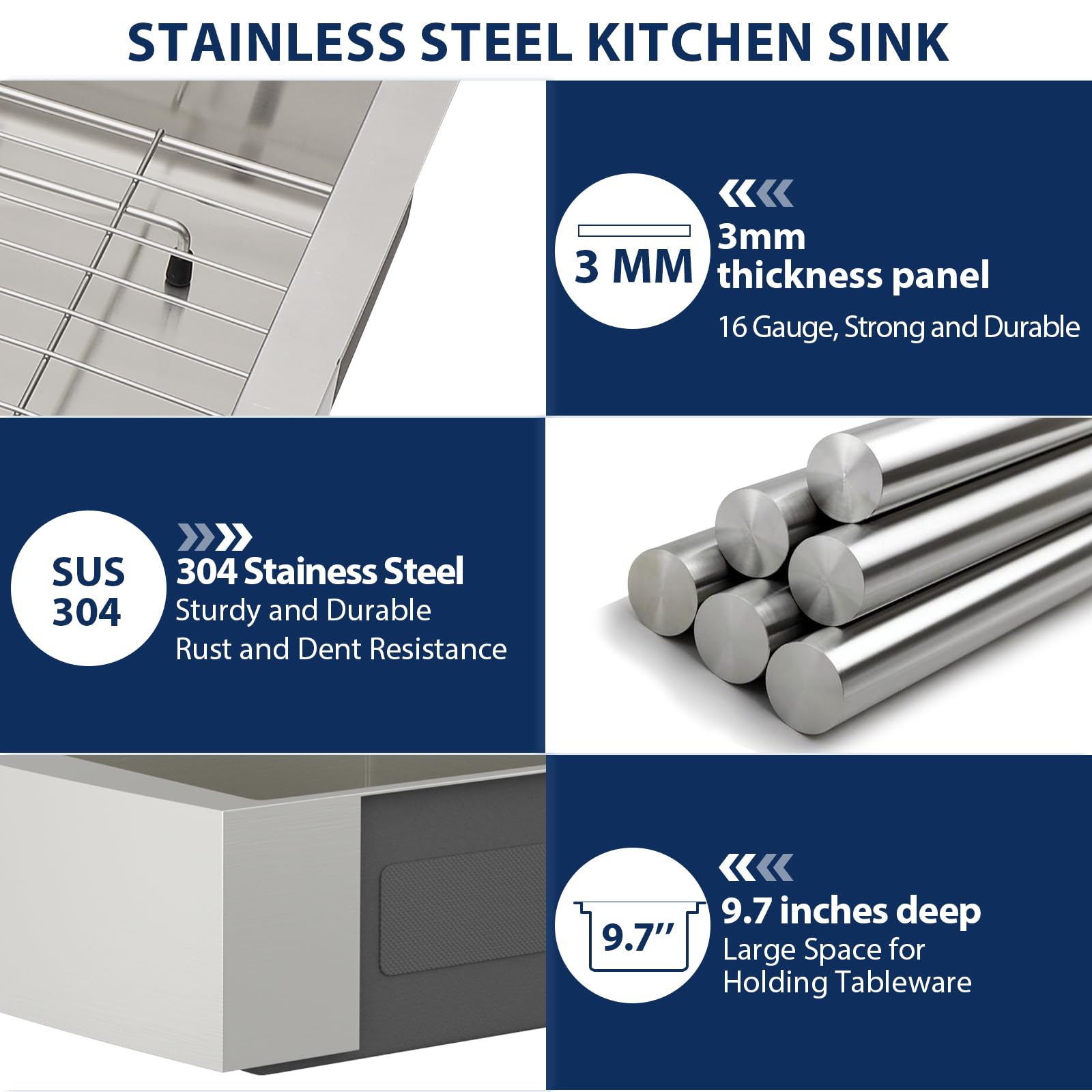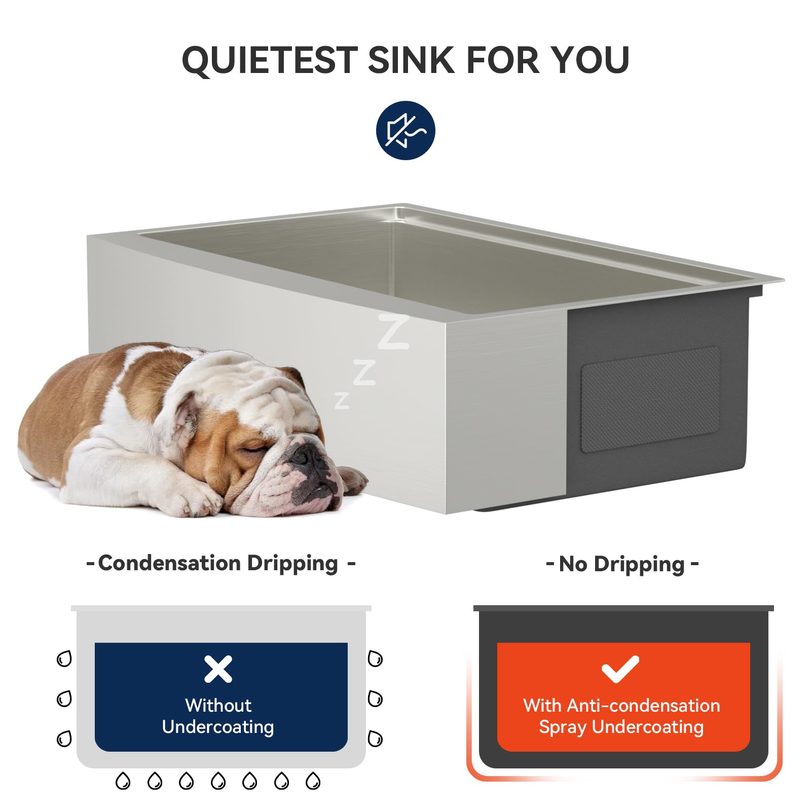 Sound /Condensation proof: Thick sound proof undercoating and heavy duty pads of this stainless steel single bowl farmhouse kitchen sink are added to minimize noise and reduce condensation