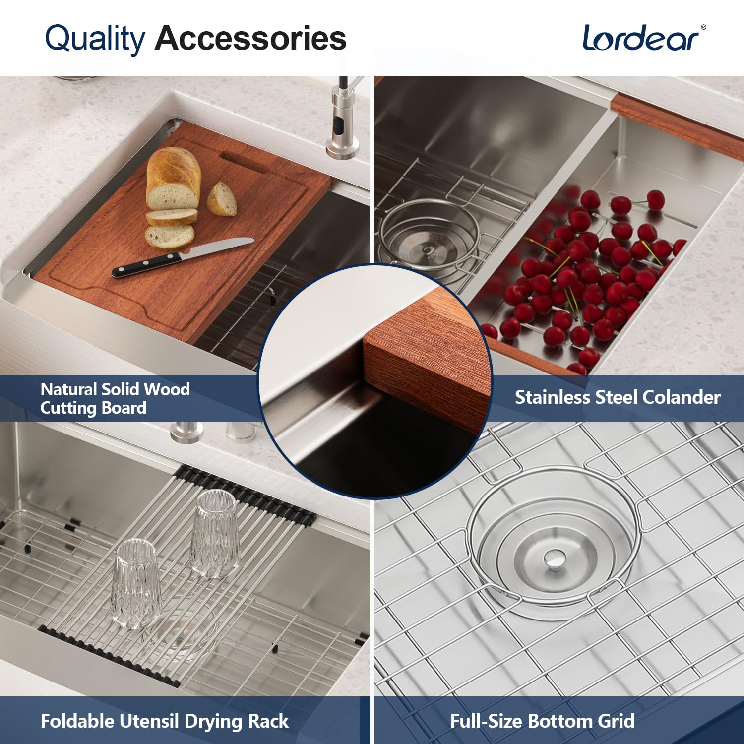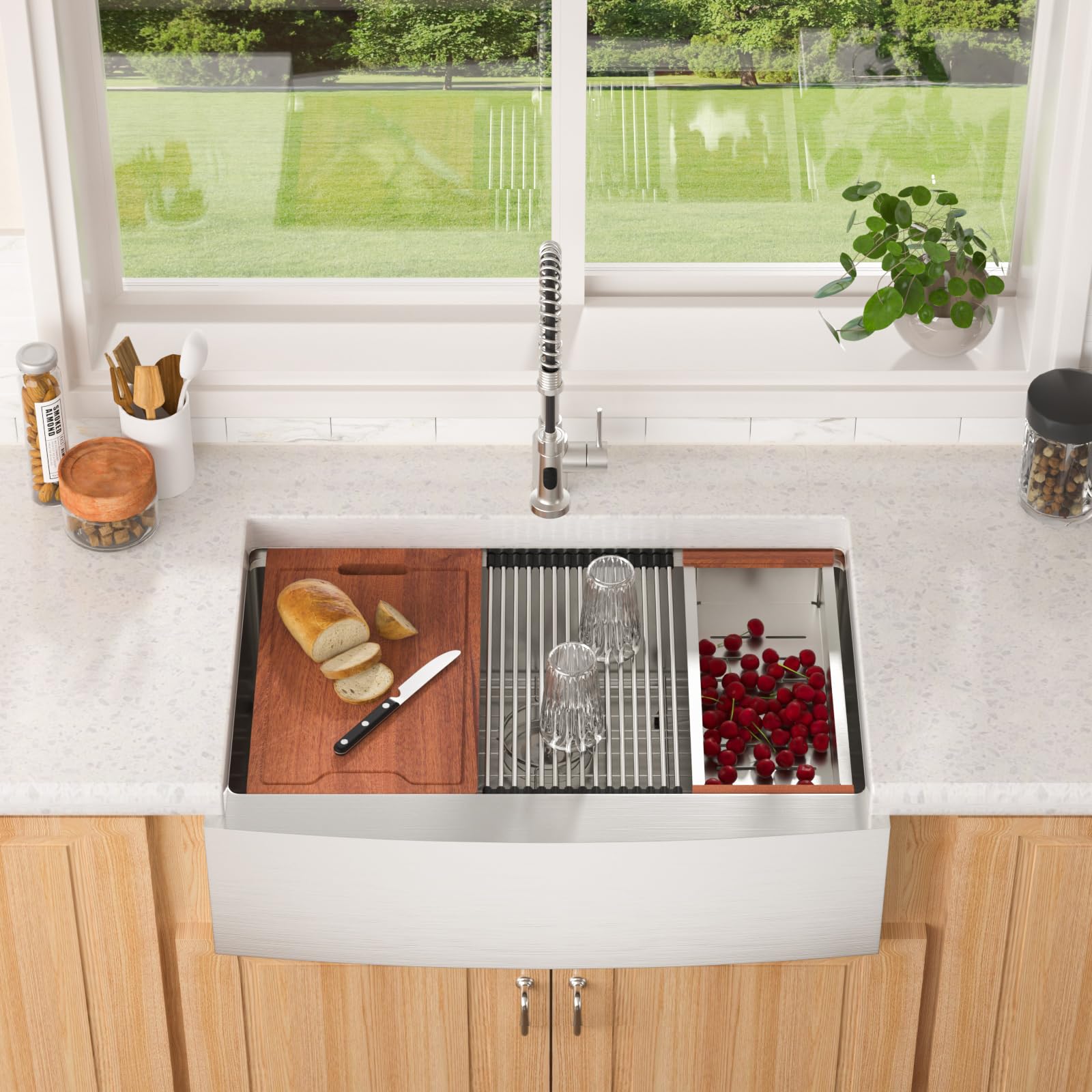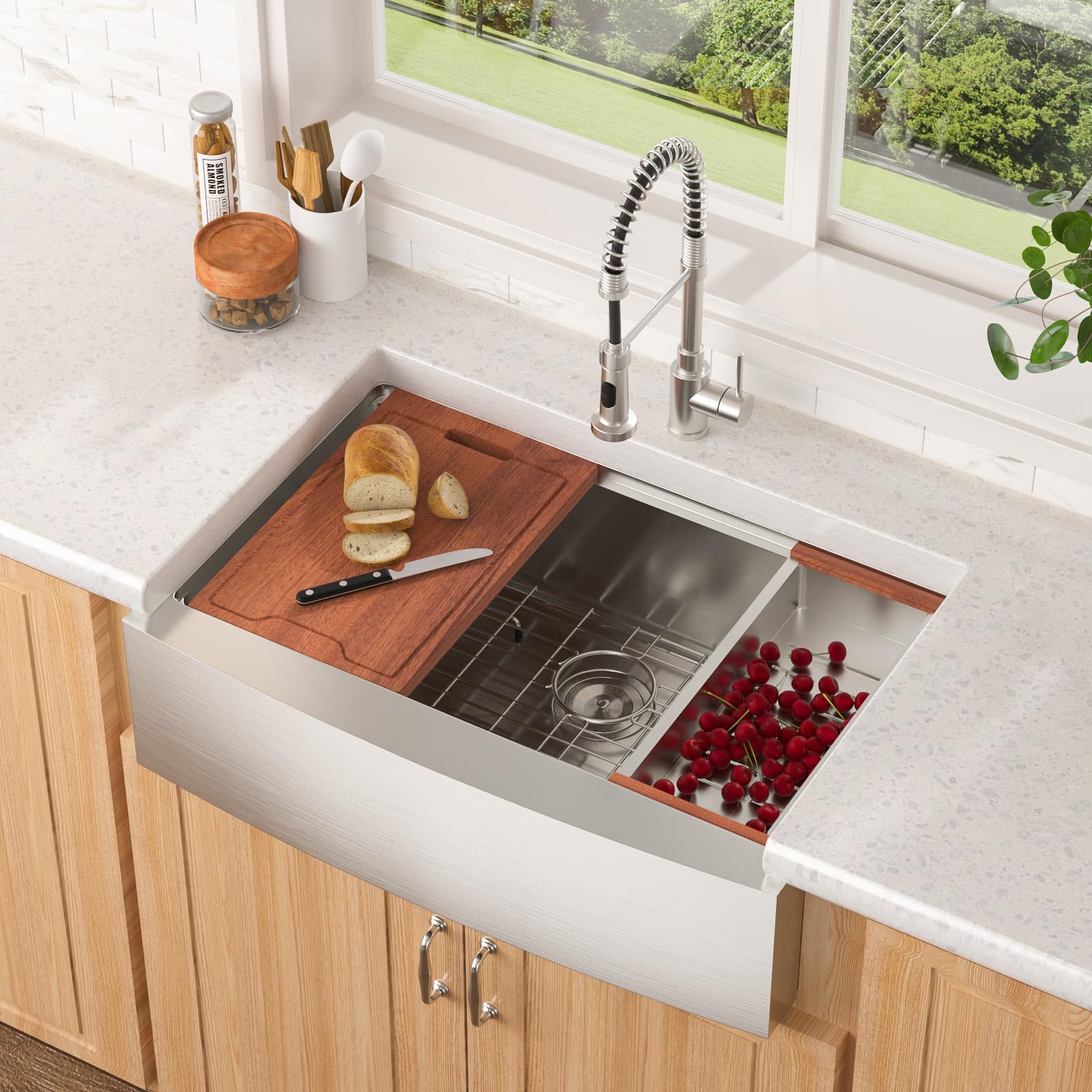 | Included Components | Dish Drying Rack, Rinse Grid, Mounting Brackets and Coutout Template, Colander, Cutting Board, 30 inch Farmhouse Kitchen Sink, Basket Strainer Drain Assembly, Decorative Drain Cover |